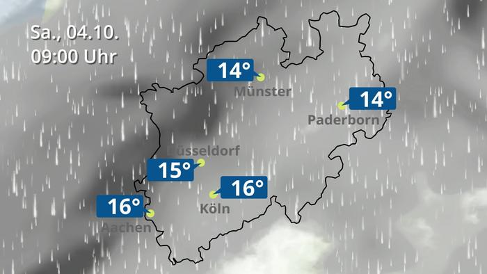 Diese Animation zeigt einen Wetterbericht für Nordrhein-Westfalen. Prognose vom 04. Oktober 2025 um 00:10 Uhr