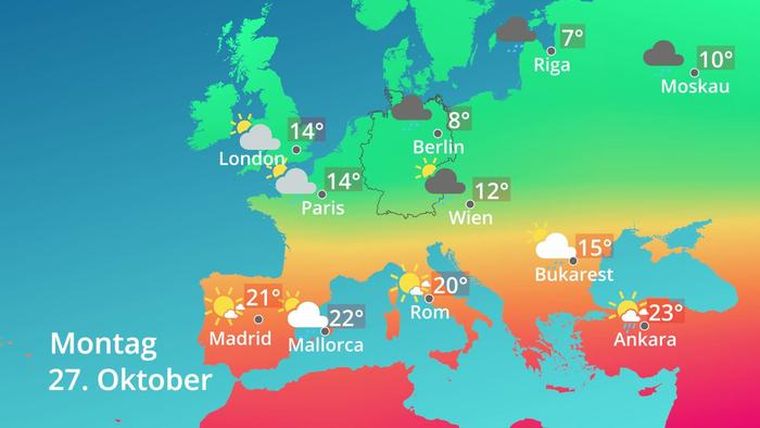 Wo gibt es schönes Wetter in Europa? Dieses Video zeigt die großflächige Temperaturverteilung in Europa als Prognose für einen Zeitraum von 10 Tagen. Hitzewellen und Kälteeinbrüche in Europa werden sichtbar und es zeigt sich, ob diese Deutschland erreichen, oder nicht. Wettersymbole und Temperaturen werden für die folgenden Städte dargestellt: Madrid (Spanien), Paris (Frankreich), London (England), Rom (Italien), Berlin (Deutschland), Wien (Österreich), Ankara (Türkei), Riga (Lettland) und Moskau (Russland). Somit vermittelt das Video einen Überblick über das Wetter in Europa für mehr als eine Woche, inklusive Wochenende. Prognose vom 25. Oktober 2025 um 00:30 Uhr