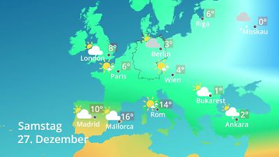Wo gibt es schönes Wetter in Europa? Dieses Video zeigt die großflächige Temperaturverteilung in Europa als Prognose für einen Zeitraum von 10 Tagen. Hitzewellen und Kälteeinbrüche in Europa werden sichtbar und es zeigt sich, ob diese Deutschland erreichen, oder nicht. Wettersymbole und Temperaturen werden für die folgenden Städte dargestellt: Madrid (Spanien), Paris (Frankreich), London (England), Rom (Italien), Berlin (Deutschland), Wien (Österreich), Ankara (Türkei), Riga (Lettland) und Moskau (Russland). Somit vermittelt das Video einen Überblick über das Wetter in Europa für mehr als eine Woche, inklusive Wochenende. Prognose vom 25. Dezember 2025 um 00:30 Uhr