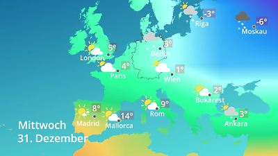 Wo gibt es schönes Wetter in Europa? Dieses Video zeigt die großflächige Temperaturverteilung in Europa als Prognose für einen Zeitraum von 10 Tagen. Hitzewellen und Kälteeinbrüche in Europa werden sichtbar und es zeigt sich, ob diese Deutschland erreichen, oder nicht. Wettersymbole und Temperaturen werden für die folgenden Städte dargestellt: Madrid (Spanien), Paris (Frankreich), London (England), Rom (Italien), Berlin (Deutschland), Wien (Österreich), Ankara (Türkei), Riga (Lettland) und Moskau (Russland). Somit vermittelt das Video einen Überblick über das Wetter in Europa für mehr als eine Woche, inklusive Wochenende. Prognose vom 29. Dezember 2025 um 00:30 Uhr