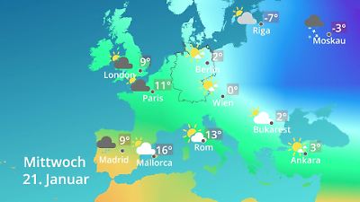 Wo gibt es schönes Wetter in Europa? Dieses Video zeigt die großflächige Temperaturverteilung in Europa als Prognose für einen Zeitraum von 10 Tagen. Hitzewellen und Kälteeinbrüche in Europa werden sichtbar und es zeigt sich, ob diese Deutschland erreichen, oder nicht. Wettersymbole und Temperaturen werden für die folgenden Städte dargestellt: Madrid (Spanien), Paris (Frankreich), London (England), Rom (Italien), Berlin (Deutschland), Wien (Österreich), Ankara (Türkei), Riga (Lettland) und Moskau (Russland). Somit vermittelt das Video einen Überblick über das Wetter in Europa für mehr als eine Woche, inklusive Wochenende. Prognose vom 19. Januar 2026 um 00:30 Uhr