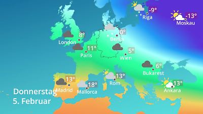 Wo gibt es schönes Wetter in Europa? Dieses Video zeigt die großflächige Temperaturverteilung in Europa als Prognose für einen Zeitraum von 10 Tagen. Hitzewellen und Kälteeinbrüche in Europa werden sichtbar und es zeigt sich, ob diese Deutschland erreichen, oder nicht. Wettersymbole und Temperaturen werden für die folgenden Städte dargestellt: Madrid (Spanien), Paris (Frankreich), London (England), Rom (Italien), Berlin (Deutschland), Wien (Österreich), Ankara (Türkei), Riga (Lettland) und Moskau (Russland). Somit vermittelt das Video einen Überblick über das Wetter in Europa für mehr als eine Woche, inklusive Wochenende. Prognose vom 03. Februar 2026 um 00:30 Uhr