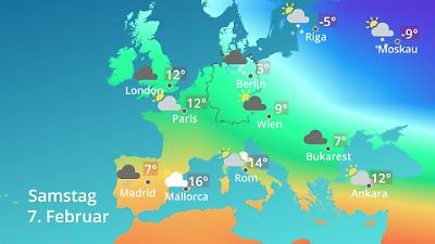 Wo gibt es schönes Wetter in Europa? Dieses Video zeigt die großflächige Temperaturverteilung in Europa als Prognose für einen Zeitraum von 10 Tagen. Hitzewellen und Kälteeinbrüche in Europa werden sichtbar und es zeigt sich, ob diese Deutschland erreichen, oder nicht. Wettersymbole und Temperaturen werden für die folgenden Städte dargestellt: Madrid (Spanien), Paris (Frankreich), London (England), Rom (Italien), Berlin (Deutschland), Wien (Österreich), Ankara (Türkei), Riga (Lettland) und Moskau (Russland). Somit vermittelt das Video einen Überblick über das Wetter in Europa für mehr als eine Woche, inklusive Wochenende. Prognose vom 05. Februar 2026 um 00:30 Uhr