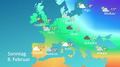 Wo gibt es schönes Wetter in Europa? Dieses Video zeigt die großflächige Temperaturverteilung in Europa als Prognose für einen Zeitraum von 10 Tagen. Hitzewellen und Kälteeinbrüche in Europa werden sichtbar und es zeigt sich, ob diese Deutschland erreichen, oder nicht. Wettersymbole und Temperaturen werden für die folgenden Städte dargestellt: Madrid (Spanien), Paris (Frankreich), London (England), Rom (Italien), Berlin (Deutschland), Wien (Österreich), Ankara (Türkei), Riga (Lettland) und Moskau (Russland). Somit vermittelt das Video einen Überblick über das Wetter in Europa für mehr als eine Woche, inklusive Wochenende. Prognose vom 06. Februar 2026 um 00:30 Uhr