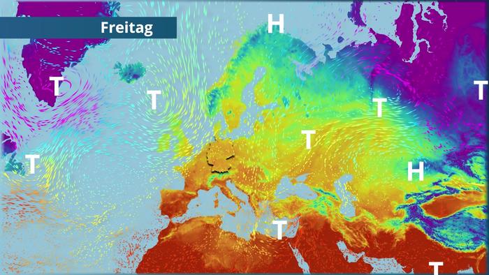 Ein Blick auf die Großwetterlage mit ihren großflächigen Luftströmungen hilft beim Verständnis des Wetterberichts. Wie ziehen die Tiefs, wie verlagern sich die Hochs? Und wie kräftig weht dazu der Wind? Die Entwicklung der Temperaturen in Deutschland und ganz Europa ist gut zu erkennen. Prognose vom 16. April 2026 um 12:00 Uhr