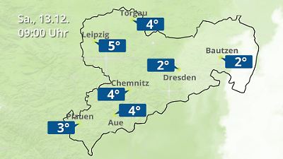 Diese Animation zeigt einen Wetterbericht für Sachsen. Prognose vom 13. Dezember 2025 um 00:10 Uhr