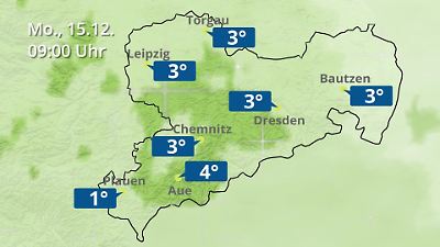Diese Animation zeigt einen Wetterbericht für Sachsen. Prognose vom 15. Dezember 2025 um 00:10 Uhr