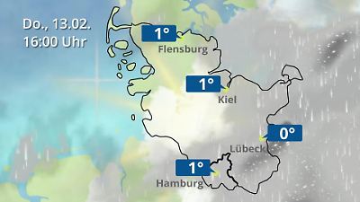 So wird das Wetter im Norden von Norddeutschland. Der Regen- und Wolkenfilm für Schleswig-Holstein und Hamburg, beziehungsweise für die Nordsee- und die Ostseeküste zeigt, wo es regnet. Für die Städte Hamburg, Kiel, Lübeck und Flensburg werden Prognosen für die Temperaturen angezeigt.