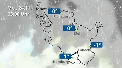 So wird das Wetter im Norden von Norddeutschland. Der Regen- und Wolkenfilm für Schleswig-Holstein und Hamburg, beziehungsweise für die Nordsee- und die Ostseeküste zeigt, wo es regnet. Für die Städte Hamburg, Kiel, Lübeck und Flensburg werden Prognosen für die Temperaturen angezeigt. Prognose vom 23. November 2025 um 18:10 Uhr