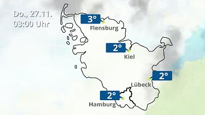 So wird das Wetter im Norden von Norddeutschland. Der Regen- und Wolkenfilm für Schleswig-Holstein und Hamburg, beziehungsweise für die Nordsee- und die Ostseeküste zeigt, wo es regnet. Für die Städte Hamburg, Kiel, Lübeck und Flensburg werden Prognosen für die Temperaturen angezeigt. Prognose vom 26. November 2025 um 18:10 Uhr