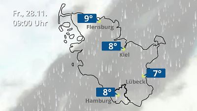 So wird das Wetter im Norden von Norddeutschland. Der Regen- und Wolkenfilm für Schleswig-Holstein und Hamburg, beziehungsweise für die Nordsee- und die Ostseeküste zeigt, wo es regnet. Für die Städte Hamburg, Kiel, Lübeck und Flensburg werden Prognosen für die Temperaturen angezeigt. Prognose vom 28. November 2025 um 00:10 Uhr