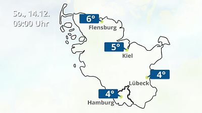 So wird das Wetter im Norden von Norddeutschland. Der Regen- und Wolkenfilm für Schleswig-Holstein und Hamburg, beziehungsweise für die Nordsee- und die Ostseeküste zeigt, wo es regnet. Für die Städte Hamburg, Kiel, Lübeck und Flensburg werden Prognosen für die Temperaturen angezeigt. Prognose vom 14. Dezember 2025 um 00:10 Uhr