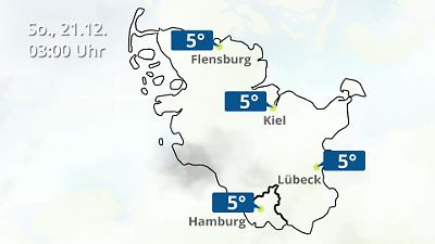 So wird das Wetter im Norden von Norddeutschland. Der Regen- und Wolkenfilm für Schleswig-Holstein und Hamburg, beziehungsweise für die Nordsee- und die Ostseeküste zeigt, wo es regnet. Für die Städte Hamburg, Kiel, Lübeck und Flensburg werden Prognosen für die Temperaturen angezeigt. Prognose vom 20. Dezember 2025 um 18:10 Uhr