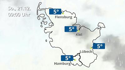 So wird das Wetter im Norden von Norddeutschland. Der Regen- und Wolkenfilm für Schleswig-Holstein und Hamburg, beziehungsweise für die Nordsee- und die Ostseeküste zeigt, wo es regnet. Für die Städte Hamburg, Kiel, Lübeck und Flensburg werden Prognosen für die Temperaturen angezeigt. Prognose vom 21. Dezember 2025 um 00:10 Uhr