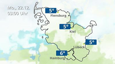 So wird das Wetter im Norden von Norddeutschland. Der Regen- und Wolkenfilm für Schleswig-Holstein und Hamburg, beziehungsweise für die Nordsee- und die Ostseeküste zeigt, wo es regnet. Für die Städte Hamburg, Kiel, Lübeck und Flensburg werden Prognosen für die Temperaturen angezeigt. Prognose vom 21. Dezember 2025 um 18:10 Uhr