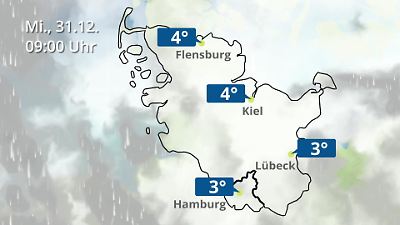 So wird das Wetter im Norden von Norddeutschland. Der Regen- und Wolkenfilm für Schleswig-Holstein und Hamburg, beziehungsweise für die Nordsee- und die Ostseeküste zeigt, wo es regnet. Für die Städte Hamburg, Kiel, Lübeck und Flensburg werden Prognosen für die Temperaturen angezeigt. Prognose vom 31. Dezember 2025 um 00:10 Uhr