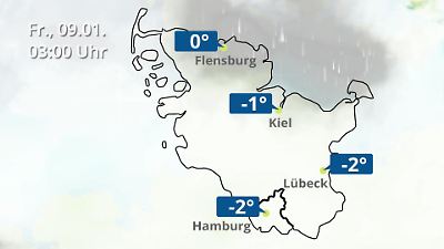 So wird das Wetter im Norden von Norddeutschland. Der Regen- und Wolkenfilm für Schleswig-Holstein und Hamburg, beziehungsweise für die Nordsee- und die Ostseeküste zeigt, wo es regnet. Für die Städte Hamburg, Kiel, Lübeck und Flensburg werden Prognosen für die Temperaturen angezeigt. Prognose vom 08. Januar 2026 um 18:10 Uhr