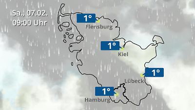 So wird das Wetter im Norden von Norddeutschland. Der Regen- und Wolkenfilm für Schleswig-Holstein und Hamburg, beziehungsweise für die Nordsee- und die Ostseeküste zeigt, wo es regnet. Für die Städte Hamburg, Kiel, Lübeck und Flensburg werden Prognosen für die Temperaturen angezeigt. Prognose vom 07. Februar 2026 um 00:10 Uhr