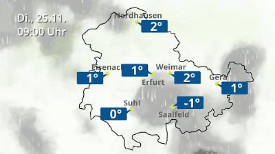 Diese Animation zeigt einen Wetterbericht für Thüringen. Prognose vom 25. November 2025 um 00:10 Uhr