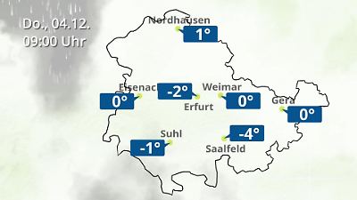 Diese Animation zeigt einen Wetterbericht für Thüringen. Prognose vom 04. Dezember 2025 um 00:10 Uhr