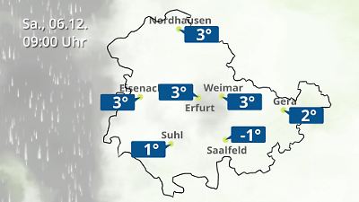 Diese Animation zeigt einen Wetterbericht für Thüringen. Prognose vom 06. Dezember 2025 um 00:10 Uhr