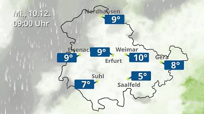 Diese Animation zeigt einen Wetterbericht für Thüringen. Prognose vom 10. Dezember 2025 um 00:10 Uhr