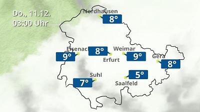 Diese Animation zeigt einen Wetterbericht für Thüringen. Prognose vom 10. Dezember 2025 um 18:10 Uhr