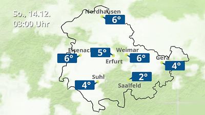Diese Animation zeigt einen Wetterbericht für Thüringen. Prognose vom 13. Dezember 2025 um 18:10 Uhr
