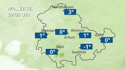 Diese Animation zeigt einen Wetterbericht für Thüringen. Prognose vom 22. Dezember 2025 um 00:10 Uhr