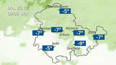 Diese Animation zeigt einen Wetterbericht für Thüringen. Prognose vom 25. Dezember 2025 um 00:10 Uhr