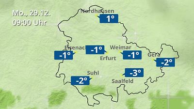 Diese Animation zeigt einen Wetterbericht für Thüringen. Prognose vom 29. Dezember 2025 um 00:10 Uhr