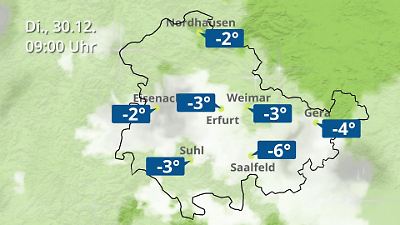 Diese Animation zeigt einen Wetterbericht für Thüringen. Prognose vom 30. Dezember 2025 um 00:10 Uhr