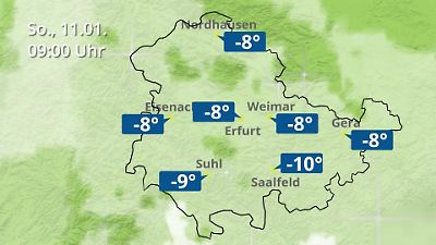 Diese Animation zeigt einen Wetterbericht für Thüringen. Prognose vom 11. Januar 2026 um 00:10 Uhr