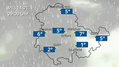 Diese Animation zeigt einen Wetterbericht für Thüringen. Prognose vom 14. Januar 2026 um 00:10 Uhr