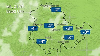 Diese Animation zeigt einen Wetterbericht für Thüringen. Prognose vom 20. Januar 2026 um 18:10 Uhr