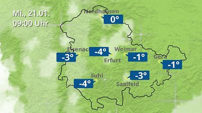 Diese Animation zeigt einen Wetterbericht für Thüringen. Prognose vom 21. Januar 2026 um 00:10 Uhr