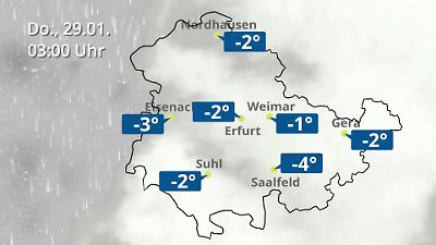 Diese Animation zeigt einen Wetterbericht für Thüringen. Prognose vom 28. Januar 2026 um 18:10 Uhr