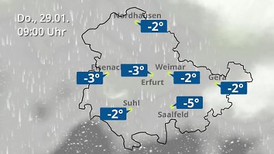 Diese Animation zeigt einen Wetterbericht für Thüringen. Prognose vom 29. Januar 2026 um 00:10 Uhr