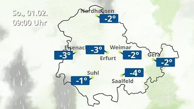 Diese Animation zeigt einen Wetterbericht für Thüringen. Prognose vom 01. Februar 2026 um 00:10 Uhr