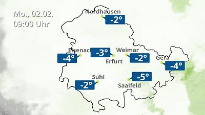 Diese Animation zeigt einen Wetterbericht für Thüringen. Prognose vom 02. Februar 2026 um 00:10 Uhr