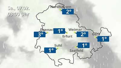 Diese Animation zeigt einen Wetterbericht für Thüringen. Prognose vom 06. Februar 2026 um 18:10 Uhr