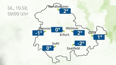 Diese Animation zeigt einen Wetterbericht für Thüringen. Prognose vom 10. Februar 2026 um 00:10 Uhr