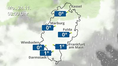 Diese Animation zeigt einen Wetterbericht für Hessen. Prognose vom 23. November 2025 um 18:10 Uhr