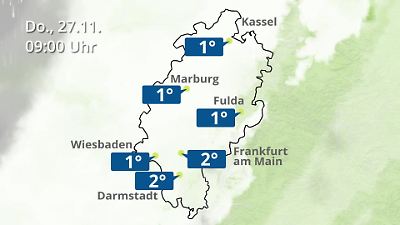 Diese Animation zeigt einen Wetterbericht für Hessen. Prognose vom 27. November 2025 um 00:10 Uhr
