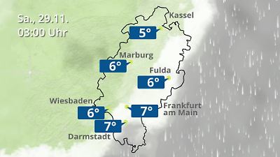 Diese Animation zeigt einen Wetterbericht für Hessen. Prognose vom 28. November 2025 um 18:10 Uhr