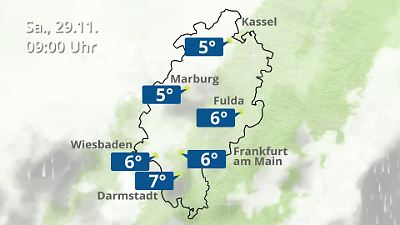 Diese Animation zeigt einen Wetterbericht für Hessen. Prognose vom 29. November 2025 um 00:10 Uhr