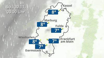 Diese Animation zeigt einen Wetterbericht für Hessen. Prognose vom 29. November 2025 um 18:10 Uhr