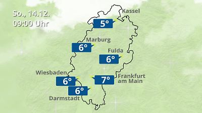 Diese Animation zeigt einen Wetterbericht für Hessen. Prognose vom 14. Dezember 2025 um 00:10 Uhr