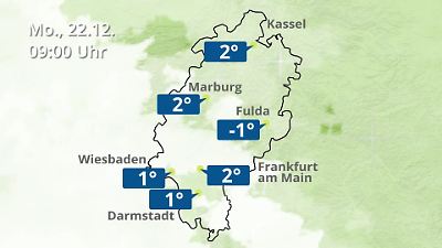 Diese Animation zeigt einen Wetterbericht für Hessen. Prognose vom 22. Dezember 2025 um 00:10 Uhr