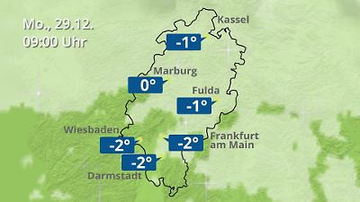 Diese Animation zeigt einen Wetterbericht für Hessen. Prognose vom 29. Dezember 2025 um 00:10 Uhr